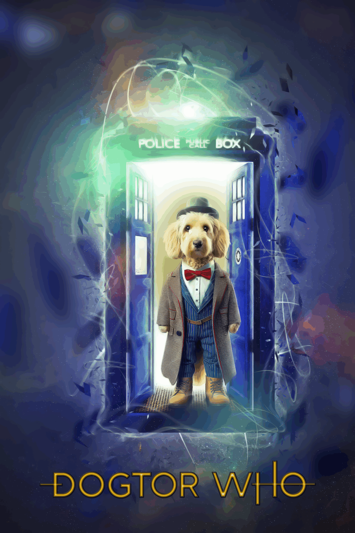 Wer braucht den DOCTOR, wenn es den DOGTOR gibt? Dieser vierbeinige Zeitreisende kommt stilecht im TARDIS-Look, mit Fliege, Mantel und Hut – bereit, Raum und Zeit mit Charme, Mut und einem wedelnden Schwanz zu retten.